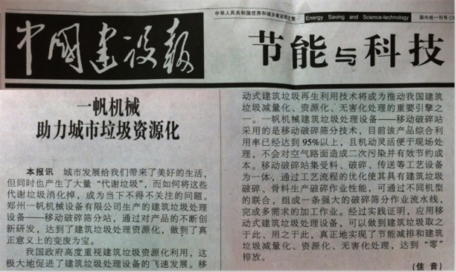 建筑垃圾可以資源化回收利用已經(jīng)不是什么新聞,據(jù)中國(guó)建設(shè)報(bào)報(bào)道稱,我國(guó)城市建筑垃圾在鄭州一帆機(jī)械設(shè)備有限公司建筑垃圾處理設(shè)備的帶動(dòng)下得到了良好的回收利用。